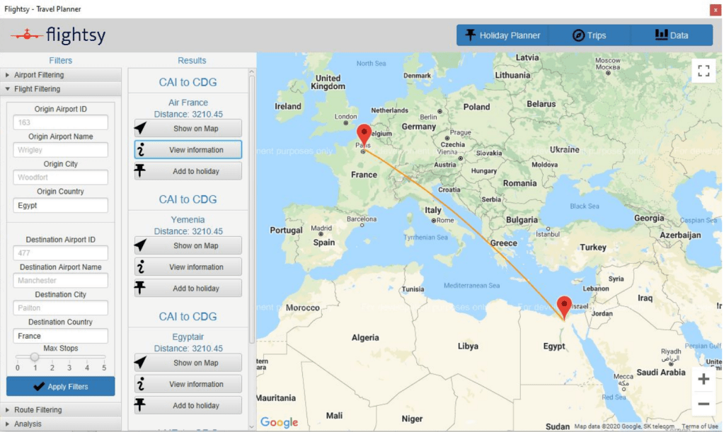 In the image, you can see we are searching for flights from Egypt to France. The application shows these flights next to the filters with a draggable map showing the start and end airports with their flight path.