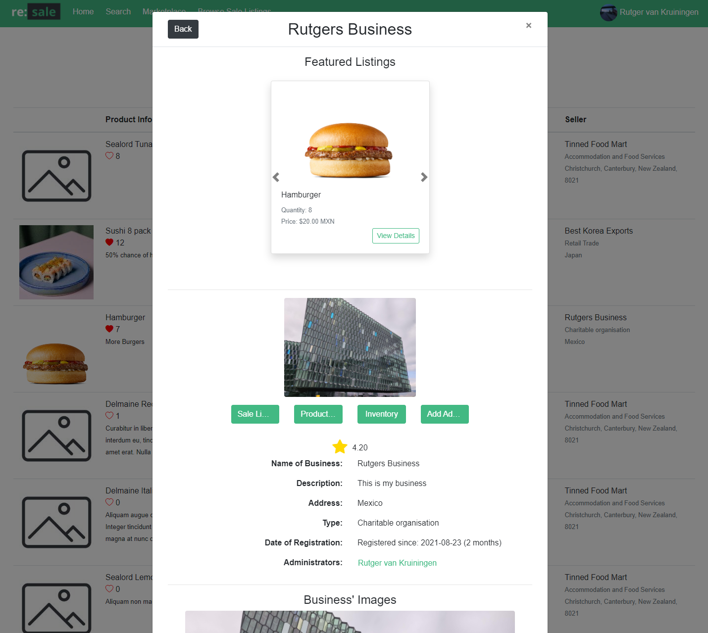 This Project was undertaken during Semesters 1 and 2 of 2021 by a team of 6, including myself. The frontend application was written in JavaScript with the help of the Vue.JS Framework and many other packages including graph.js for a graphical user interface and Bootstrap for design simplicity and scalability. The backend of this app was written in Java with the Spring Framework which allowed us to manage requests made by the frontend, to control authentication and the management of data to and from the MariaDB Database. This application is made robust to be able to support large datasets, an example of this is our users and businesses. We have 10,000 users and 1,000 businesses registered with resale, whilst keeping the apps requests responsive.